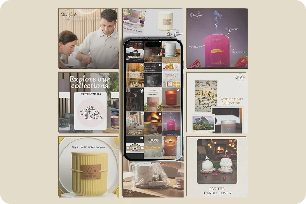 In discovery, we learned that Glow & Scent is built around more than fragrance. Each candle is inspired by Karolina’s global travels and designed to be both a sensory experience and a piece of home décor. Each collection has its own personality, mood and story, from wedding gifts to “happily ever after” sets and curated gift boxes. Beneath the surface, the real problem was simple: there was no platform to tell this story or to sell at scale. Without a website or social presence, Glow & Scent looked like a small hobby business rather than the considered, intentional brand it really is. We prioritised getting a clean, conversion-focused e-commerce website live, then layered in social media, email marketing and coordinated photography and video to support ongoing campaigns.